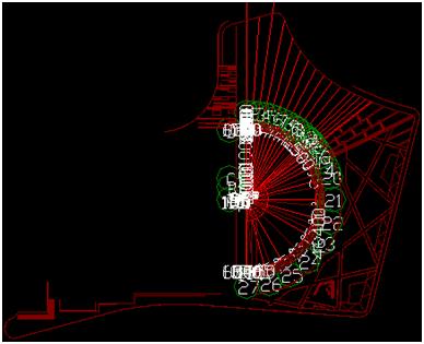 2、在建立軸網(wǎng)時,因景觀類工程一般沒有標準的縱橫軸線和軸線標識,所以需要充分利用已有的電子版CAD圖。在識別CAD圖時,可以把主要畫圖要用到的定位線作為軸線提取,如硬質(zhì)鋪裝和綠化邊線、人行道路沿線、林蔭步道的邊線、臺階邊線等;把其他需要輔助畫圖的線作為軸線標識提取,如綠化盲溝線、雨污水井邊線等。總之盡可能地多導入CAD圖里面的線條元素。本工程導入CAD后如圖: