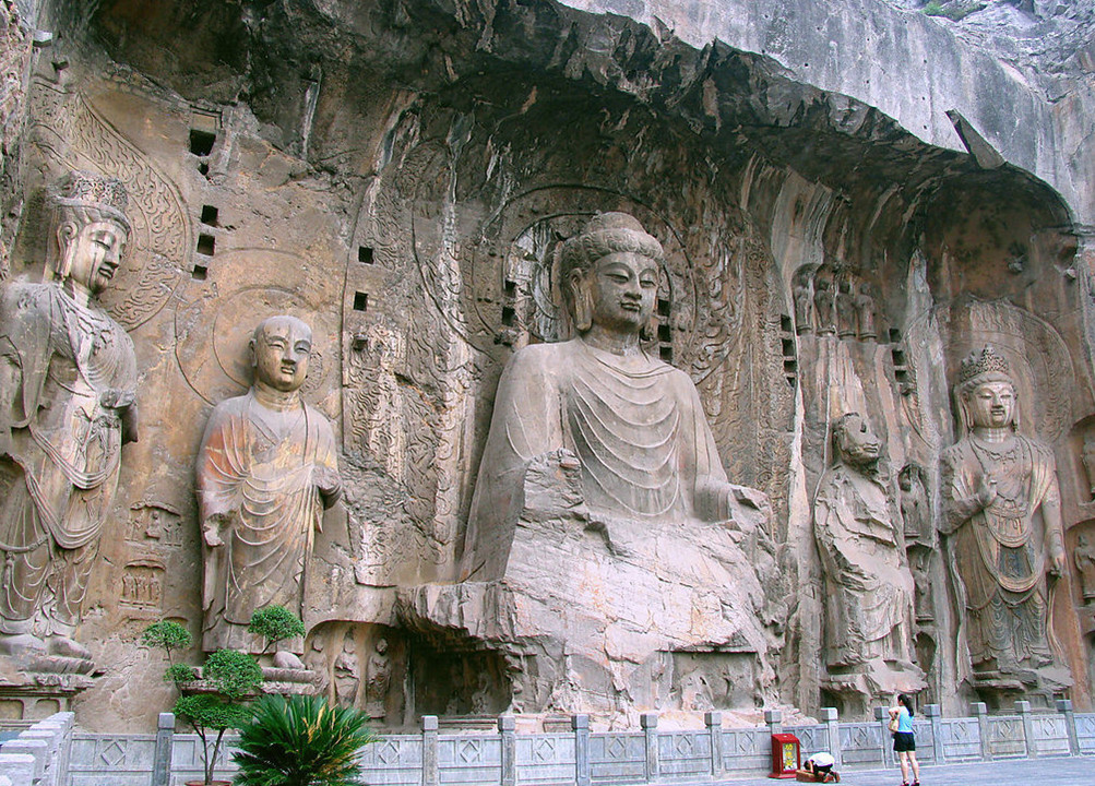 距市區(qū)13公里的龍門是洛陽南面的天然門戶,這里兩岸香山、龍門山對(duì)立,伊水中流,遠(yuǎn)望就象天然的門闕一樣。因此自春秋戰(zhàn)國(guó)以來,這里就獲得了一個(gè)形象化的稱謂“伊闕”。隋煬帝都洛陽,因?qū)m城城門產(chǎn)正對(duì)伊闕,古代帝王又以真龍?zhí)熳幼跃?因此得名“龍門”,“龍門”之名即延用至今。舉世聞名的龍門石窟就雕刻在伊河兩岸的山崖上,南北長(zhǎng)約1公里。從北魏孝文帝遷都洛陽時(shí)開始營(yíng)造,經(jīng)過東魏、西魏、北齊、隋、唐、延至北宋,累計(jì)大規(guī)模開鑿約四百余年,現(xiàn)存窟龕2345個(gè),碑刻題記2800余塊,佛塔70余座,造像近11萬尊。其窟龕、造像和題記數(shù)量之多,居中國(guó)石窟之冠,與敦煌莫高窟、大同云岡石窟并稱為中國(guó)三大佛教藝術(shù)寶庫(kù)。中華人民共和國(guó)國(guó)務(wù)院于1961年確定龍門石窟為全國(guó)第一批重點(diǎn)文物保護(hù)單位。2000年11月,聯(lián)合國(guó)教科文組織第24屆世界遺產(chǎn)委員通過列入《世界遺產(chǎn)名錄》。