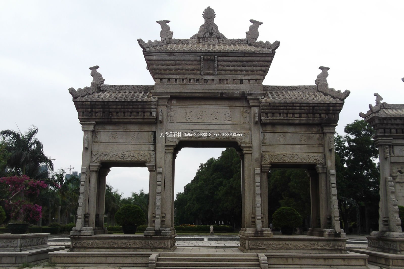 解放后因擴建馬路需要移走,一建公司的師傅們連夜施工,整拆整蓋,原樣又建在了城南的陶然亭公園,多好的東西啊!‘文革’中楞把它說成是“四舊”,下場是被砸爛、棄之。 寺院石雕山門 北京齊化門(今朝陽門)外神路街口的琉璃牌樓是北京同類牌樓中最大的,那是老東岳廟的遺物,現(xiàn)在掛上了“文物保護’的牌子。整個北京城保存下來最大的石牌樓得數(shù)明十三陵的牌樓,是六柱五間十一樓,建于嘉靖十九年,至今有小五百年的光景啦。這牌樓高十四米多,長有二十九米,梁朽、斗拱、屋頂都是仿木制結(jié)構(gòu)的形制雕刻成的。梁朽上雕刻出旋子點金彩畫,從殘存的顏色還能隱約看出當(dāng)年石坊上曾經(jīng)有過美麗的彩繪。在石坊六根方柱石下是巨大的夾柱石(又叫袍柱石座),石上雕刻著巨龍、海獸、獅子、麒麟和云氣波濤,鬼斧神工的匠術(shù)令人贊嘆不已。 今天,古老的北京在保護和修葺古老牌樓的同時,一些新的牌樓也拔地而起:王府飯店前面的牌樓,琉璃廠文化街的牌樓,紫玉飯店的牌樓,地壇公園西門外的牌樓,還有老北京微縮景園的牌樓……得,聊這么會子啦,今兒個就先到這兒,您抽功夫迢彎,看看這些個牌樓那不也是件有意思的事嗎?興許到時咱們還能碰上,到那時我沏上壺好茶再跟您慢慢聊吧!.