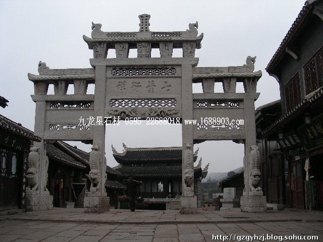 其實(shí),在我看來(lái),而現(xiàn)在新建的牌坊,構(gòu)建意圖已經(jīng)遠(yuǎn)遠(yuǎn)離開(kāi)了被打上封建主義的那些色彩烙印。在用意上已經(jīng)擴(kuò)展了它的內(nèi)涵,使其外延更為豐富和更具觀賞性。如地名、旅游點(diǎn)、廟宇、山門(mén)等以牌坊作為門(mén)頭等標(biāo)志性建筑物,用來(lái)標(biāo)明地名,宣傳文化的建筑物。那些刻寫(xiě)在牌坊上面的楹聯(lián)文字,雖片言只語(yǔ),卻道出了一些人生哲理與敘事抒情趣事趣聞,可謂深淺皆成趣,雅俗均共賞。