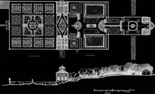 莊園四層臺地的布局均由一條中央軸線連接而成。中央軸線為一流水線,而各臺地再此軸線上都設(shè)有水景?;▔?、建筑、臺階等均對稱布置在軸線兩側(cè)。在園路布置方面也順應(yīng)軸線兩側(cè)布置,再以橫向園路連接。整個園雖由圍墻封閉,但在橫向縱向均設(shè)有多個門口方便出入。由于莊園設(shè)在臺地上,所以臺階的布置尤為重要。臺階不僅僅是用于連接每層臺地,另一重要的作用是引導(dǎo)游人走向園中最美的景色中。所以每一層的臺階布置都有所不同。如連接二、三層的臺階并沒有設(shè)為縱向連接,而是設(shè)為橫向上坡,其目的是讓客人的目光轉(zhuǎn)向美麗的水景。而連接三四層的臺階也是為了將客人引向水階梯。