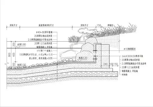 2.對(duì)于小型人工湖和造價(jià)許可時(shí)可以采用鋼筋混凝土硬質(zhì)湖底和駁岸。湖底具體做法可查閱文科相關(guān)項(xiàng)目設(shè)計(jì)圖紙。
