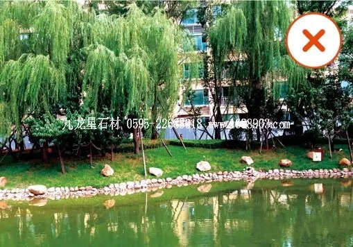 駁岸的景石擺放太陣列式,缺乏形式變化,顯得單薄廉價(jià)、不夠自然。(禁止)