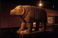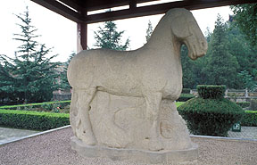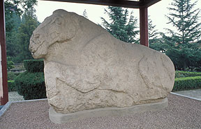 古代陵園石雕遺存實物最早的是引人注目的西漢霍去病墓石雕,作品原在陜西省興平縣漢武帝茂陵東面霍去病墓上與墓前。現(xiàn)已發(fā)現(xiàn)的石雕作品有造型各異、天趣宛然的動物、人物等共十四件。霍去病為西漢名將,漢武帝為表彰其功、紀(jì)念其人,于茂陵東面選定其墓址并“為冢象祁連山”,據(jù)《史記?衛(wèi)將軍驃騎傳?索隱》記:其墓“冢上有豎石,前有石馬相對,又有石人”。今存作品即記載中的部分原物。它們可以分為兩類,一是通常被稱之為“馬踏匈奴”的立馬,二是其它渚石。立馬的原在位置是墓前不遠(yuǎn),長年來未有大的移動,從形式上看為靜立姿態(tài),尺度適中,符合一般早期墓前石雕的制作規(guī)律,相信此即記載中相對而立的石馬,只是另一件已無存,“石人”也不見了。唐薛逢《漢武帝祠》詩云:“茂陵煙雨埋弓箭,石馬無聲蔓草寒”。詩中所指茂陵石馬當(dāng)系帝陵制度,但與霍墓立馬的位置及造型表現(xiàn)肯定有直接關(guān)系。西漢時期陵園墓前設(shè)置石雕已成風(fēng)氣,關(guān)于石人石獸的記載與遺存并不罕見,因此霍去病墓前石馬并非例外,實屬常規(guī)設(shè)置,它為我們提供了代所完善的石象生設(shè)置與造型形式之源的現(xiàn)知最早實物證據(jù)。