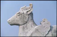 漢代墓葬手段逐漸完善之時,神靈的偶像也大規(guī)模出現(xiàn),它們體現(xiàn)著人們對神的認(rèn)識、崇拜和依賴,它被認(rèn)為會給陵墓帶來吉祥,給墓主靈魂以庇護和幫助,會驅(qū)逐鬼怪邪祟。魏晉南北朝時期這種偶像化更為明顯,為后代確定了神靈崇拜的偶像模式。陵園神道兩側(cè)列置著石雕天祿辟邪;墓室里陳放著陶塑的鎮(zhèn)墓獸;壁畫描繪著羽人、飛天、神靈;墓門棺槨上也刻劃著方相氏的形象。前代的這種審美表現(xiàn)因素影響著唐陵石雕藝術(shù)表現(xiàn)的一個重要方面,即歸結(jié)出天馬、天鹿等神靈崇拜的占有一定比例的造型表現(xiàn)部分。末陵石雕的角端、瑞禽明清陵園石雕的麒麟、獬豸等都是這種基礎(chǔ)內(nèi)容模式的演變。先民們試圖通過陵墓這一特殊的環(huán)境達(dá)到人與神的有效溝通,在這個意義上造型手段起著關(guān)鍵性作用。陵墓被視為人神共處的理想化的虛幻而可信的環(huán)境,在這里天國、人間、地獄融為一體,形成完整的世界??梢哉f,對神靈的崇拜心理和原始宗教的世界觀是決定墓葬表現(xiàn)形式的重要因素。