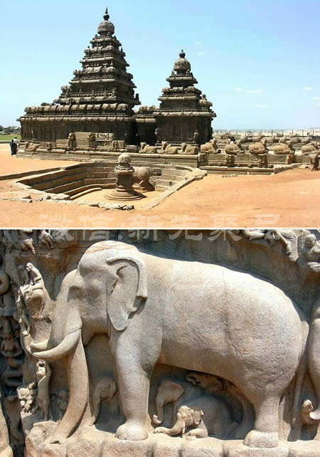 馬哈巴利普蘭岸上寺,8世紀(jì)初由帕拉瓦國王Rajasimha建于印度的馬哈巴利普蘭海灣。實(shí)際上由兩座背靠背的神殿組成,一座面向東方,較小的則面向西方。岸上寺屹立在孟加拉灣的邊緣。漲潮時(shí),海浪會(huì)拍打寺體,墻壁即周邊的雕塑已經(jīng)歷經(jīng)了1300年的風(fēng)吹浪打,卻依舊安然無恙。