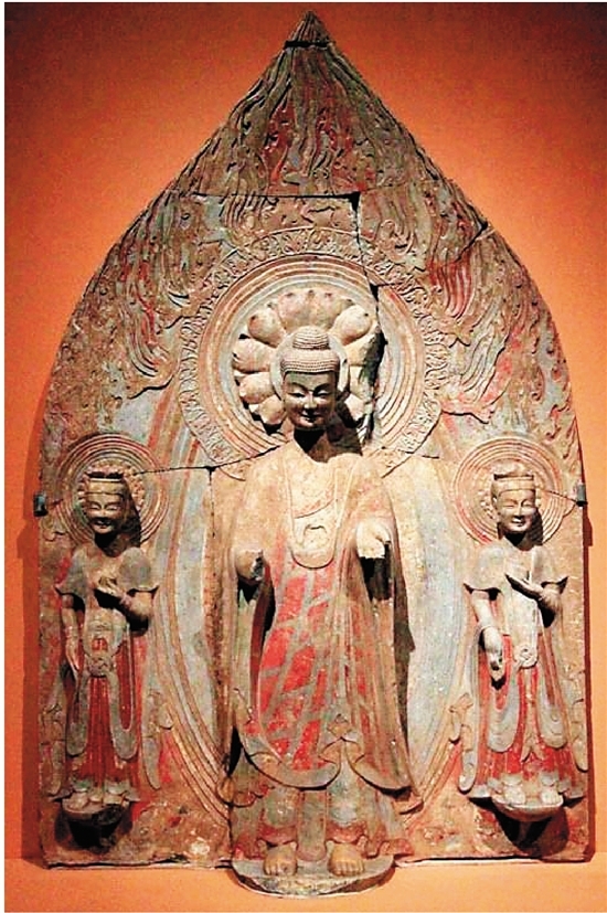 1996年,青州龍興寺遺址窯藏共出土北魏至北宋佛教造像400余尊,其中以東魏和北齊時(shí)期的數(shù)量最多。青州地區(qū)曾先后隸屬于南朝和北朝,南北文化 上的交互影響較為明顯,在公元469年北魏占領(lǐng)青州以前,青州長(zhǎng)期隸屬于南朝,所以在造像風(fēng)格上與北朝造像有明顯的不同。青州地區(qū)佛教造像除政治沿革遺留 的影響,還應(yīng)有不同地區(qū)交流的因素。這時(shí)海路可以與東南沿海相通,笈多美術(shù)通過(guò)海路傳入也在一定程度上促進(jìn)造像樣式的形成與發(fā)展。如東晉義熙年間,法顯自印度取經(jīng)回國(guó),返抵青州,青州長(zhǎng)廣郡太守李巍敬信佛法,迎接經(jīng)像歸至郡治,留法顯一冬一夏,法顯所奉佛像自然是地道的笈多風(fēng)格。