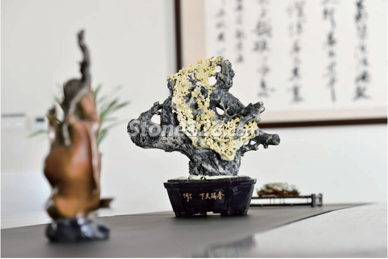 在內(nèi)室陳列柜上放置石雕作品,暖色的背景與燈光相融合,溫和的造型與豐富的陳列物品相諧調(diào),充分體現(xiàn)了這件石雕作品中溫馨典雅的內(nèi)涵。