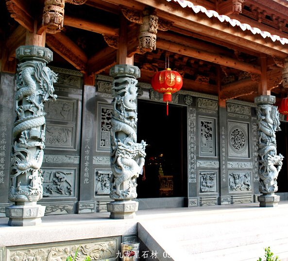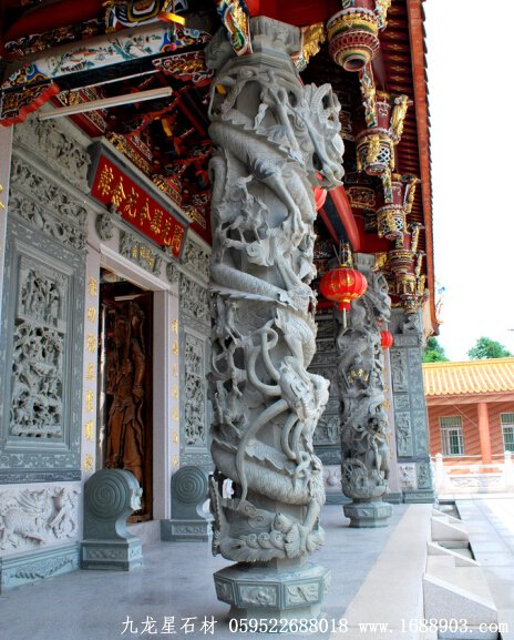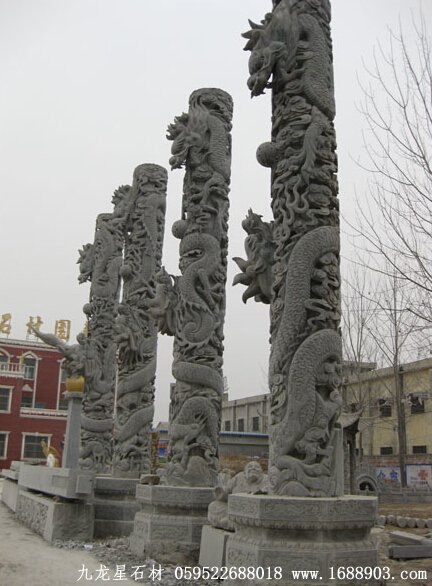 青石九龍柱塑有纏柱云龍,柱上橫貫一塊美麗的云板,好似行云插入云際。頂端承露盤上的蹲獸,栩栩如生。素有吉祥、華貴、誠信等意,是單位公司、家居、辦公裝飾、園林觀賞、饋贈等之佳品!立在廣場路邊成為景觀和地標(biāo) ...
