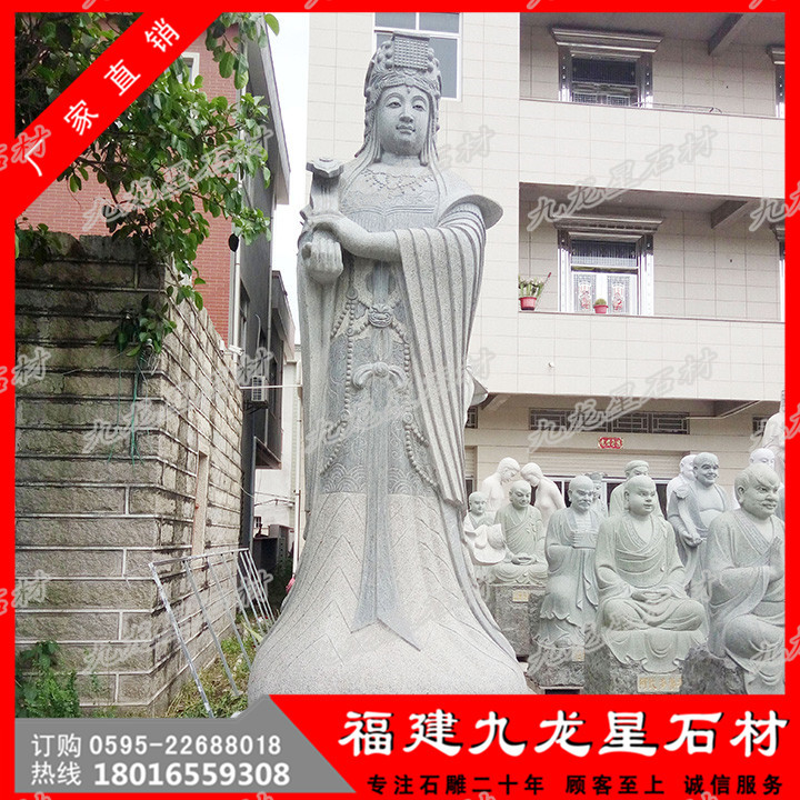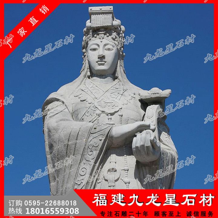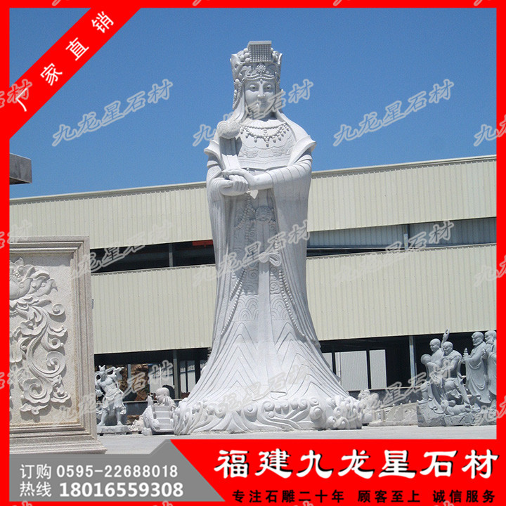 大型石雕媽祖中國(guó)民間在海上航行要先在船舶啟航前要先祭媽祖,祈求保佑順風(fēng)和安全,在船舶上立媽祖神位供奉。這就是“有海水處有華人,華人到處有媽祖”的真實(shí)寫照。而影響所及,媽祖由航海關(guān)系而演變?yōu)椤昂I瘛?、“護(hù)航女神”等,因此形成了海洋文化史中最重要的中國(guó)民間信仰崇拜神之一。